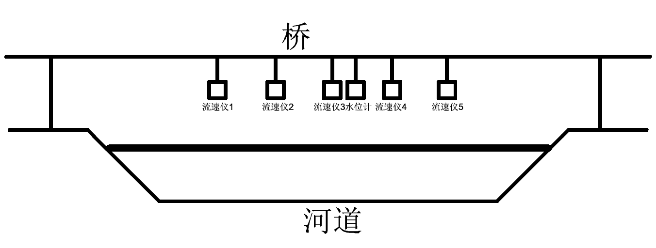 將流速儀探頭均布在橋的上方,用支架固定牢靠,調(diào)節(jié)流速儀的安裝角度,45-60°為適合的角度;雷達水位計放置在橋梁中間并用支架固定,多臺流速儀和水位計通過4芯電纜穿管走線至站房內(nèi),并連接至站房內(nèi)的遙測終端機,遙測終端機將數(shù)據(jù)匯總上傳。(備注:橋可以用纜道代替)
