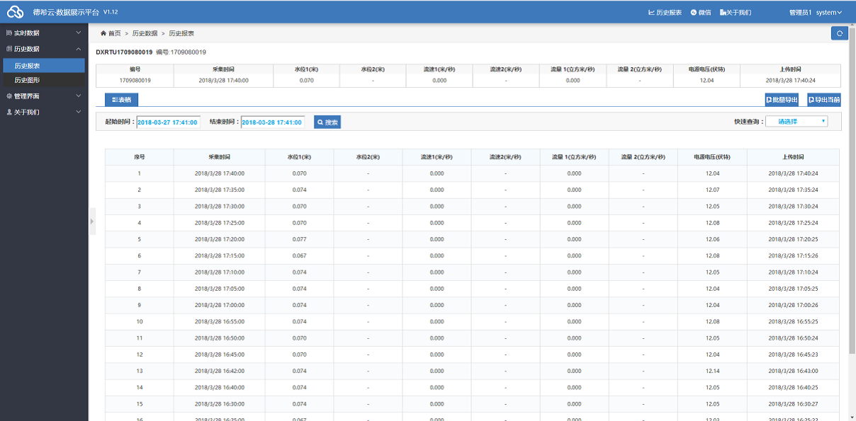 遙測終端機每5分鐘(可根據(jù)情況設(shè)定)采集底層傳感器的數(shù)據(jù),并將其發(fā)送至相應(yīng)的服務(wù)器,通過數(shù)據(jù)查看平臺可以實現(xiàn)實時數(shù)據(jù)的查看、歷史報表、歷史圖形、導(dǎo)出excle等。