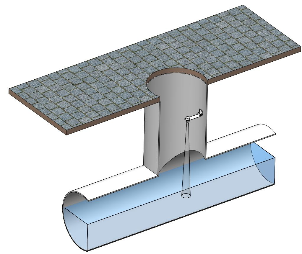 雷達(dá)水位計通過易拆卸的安裝支架安裝在檢查井的中間位置且位于井蓋正 下方即可,同時需要保證雷達(dá)水位計水平安裝。如下圖所示,此種安裝方式易于 RTU 的通訊和后期維護(hù)時更換電池。安裝支架采用不銹鋼材質(zhì),采用模塊化設(shè)計。